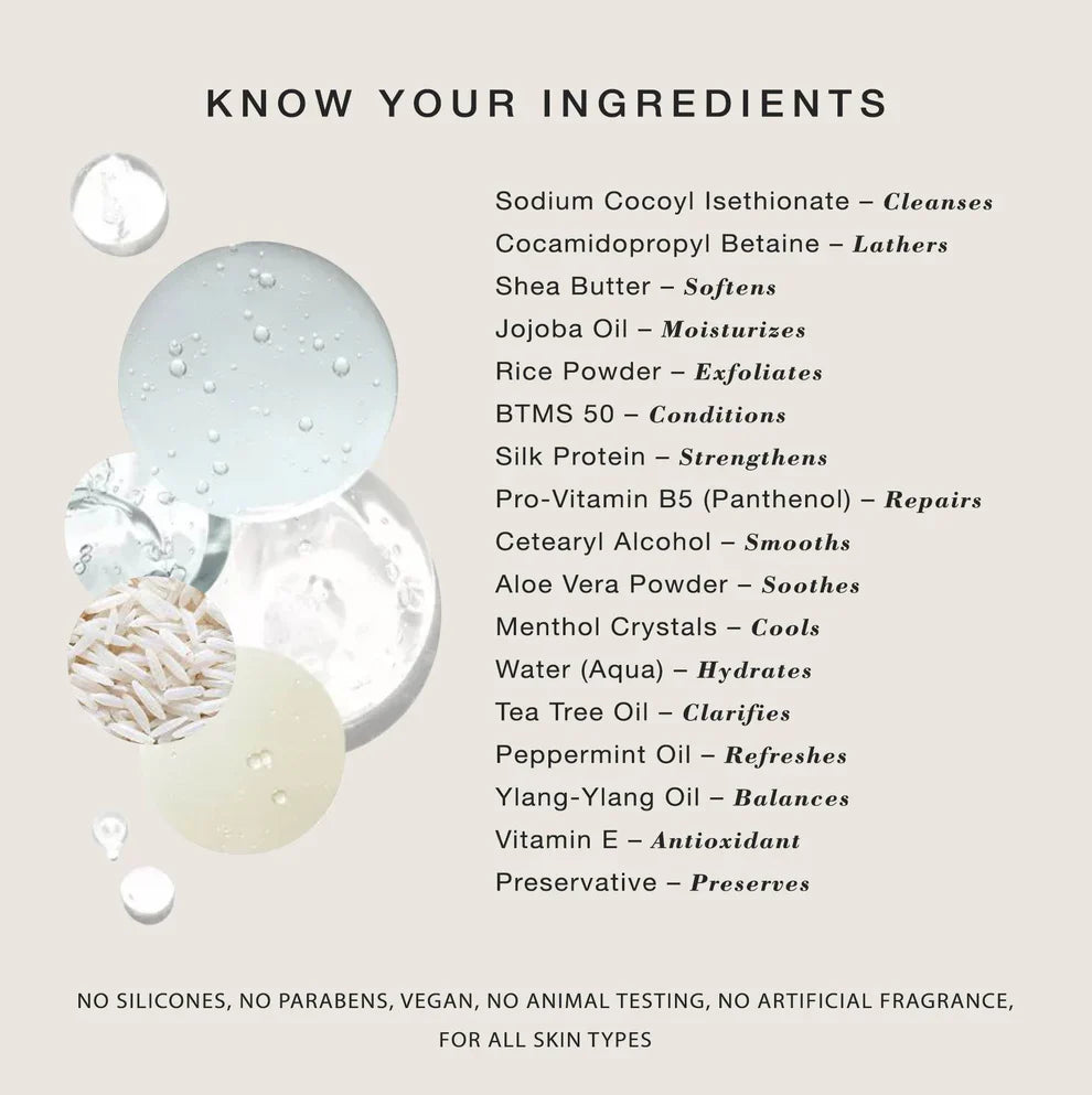 A nourishing shampoo bar that strengthens and repairs hair with Rice Powder and Hydrolyzed Silk Protein. Enriched with Shea Butter, Jojoba Oil, and soothing essential oils, it moisturizes, softens, and refreshes the scalp. Gently cleanses without stripping natural oils, leaving hair healthy, smooth, and radiant.